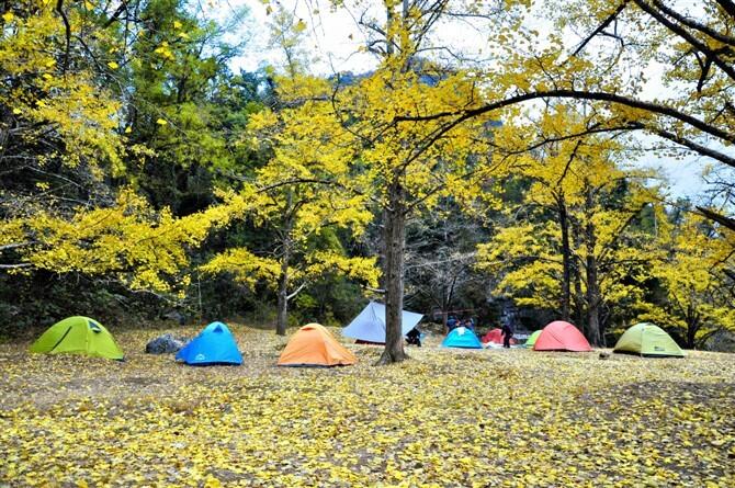 第一天:周六早上7:00沃顿国际大酒店集合7点30分准时出发,过期不候!中午在高速路上的服务区休息吃午饭。大约中午13:30到达海洋乡,徒步进大木桐湾村吃农家饭(村口要卫生费,请自理哦,要不一个等一个很浪费时间,主要是路边很多各种特产辣椒酱桃胶小吃等),主菜白果土鸡,配青菜围火锅。正宗的土鸡哦,已经谈好价钱,350一桌.饭饱酒足后,把行李搬到大片的银杏树下扎营,满天满地满眼都是黄色的世界里露营绝对是不一般的体验.扎营后,或者拍完照后再扎营都可以,多带几套衣服衣服去拍照,鲜艳的衣服去哪拍照都会很上镜,在黄色的世界里的一点真的很妖艳很迷人