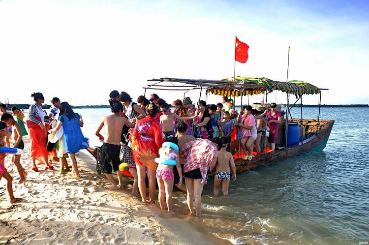 全体成员自行更换泳衣,准备等候乘船上岛(没轮到上岛的可以自由活动,可以先搭帐篷)
